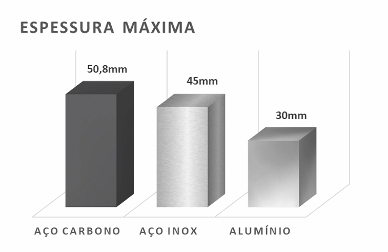 | Aço carbono | 50,8 mm | 2,50 m × 6,00 m |